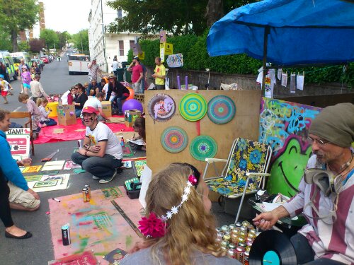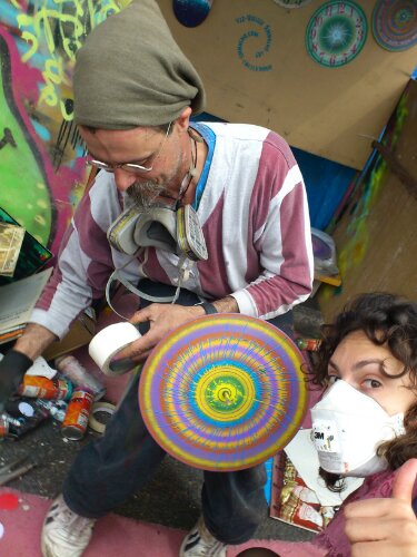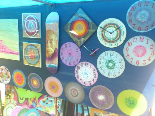 We pitched in a side street which was nice at first only to find that we were out of the.main traffic flow and that the mouth of out street served a a perfect stage forth local samba band! Whistles and drums beat loudly making communication near impossible… So I went for a walk instead. I met the badge lady who inspired me to make some of my own using my spin painting as a design template – I made 8.